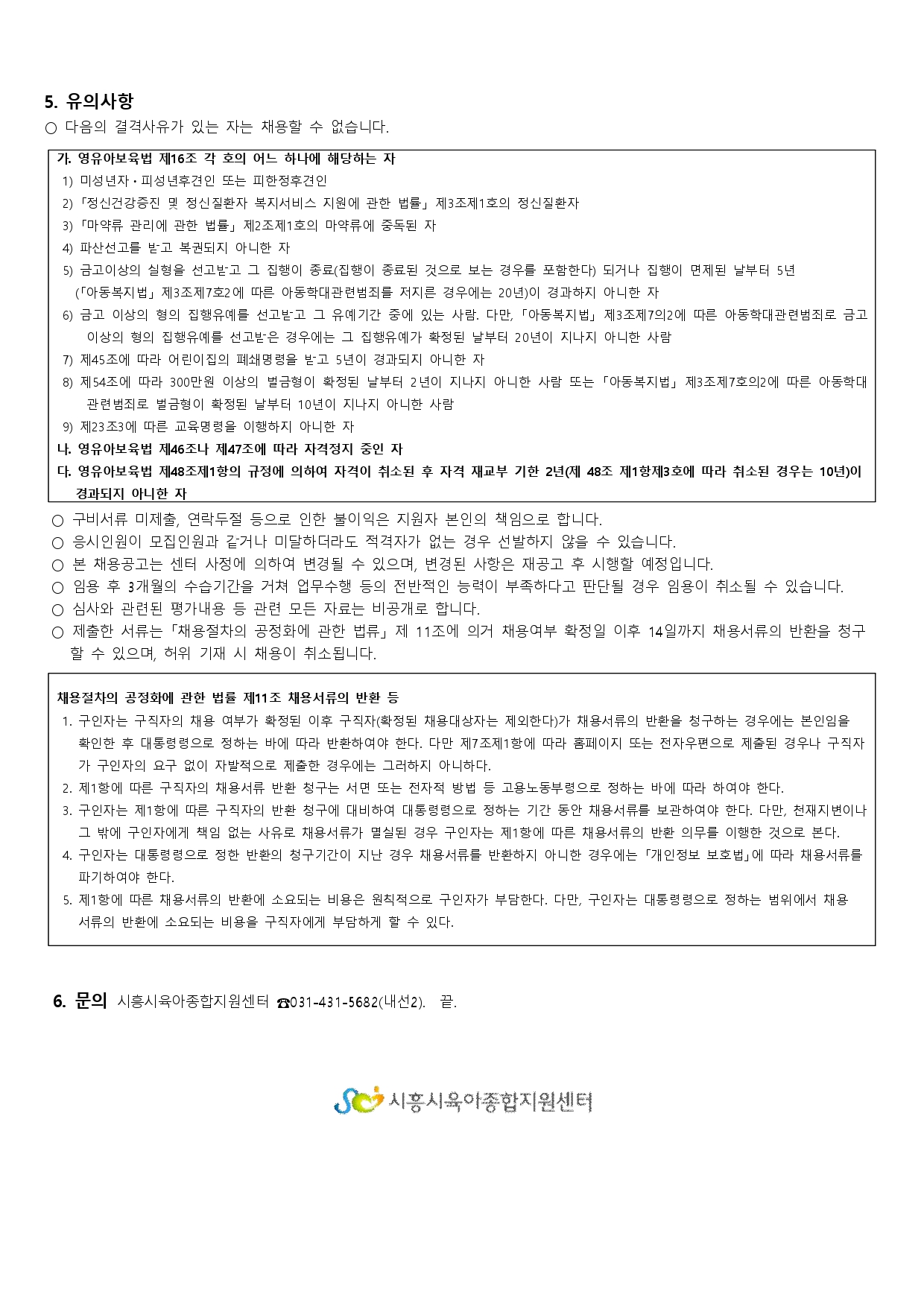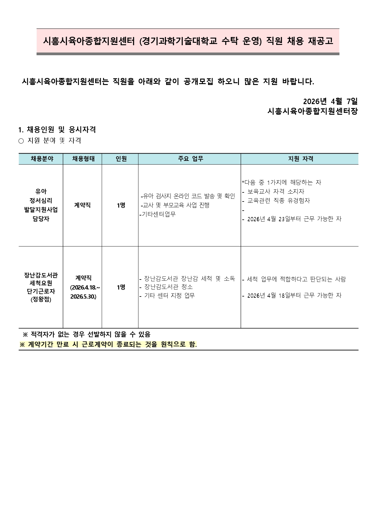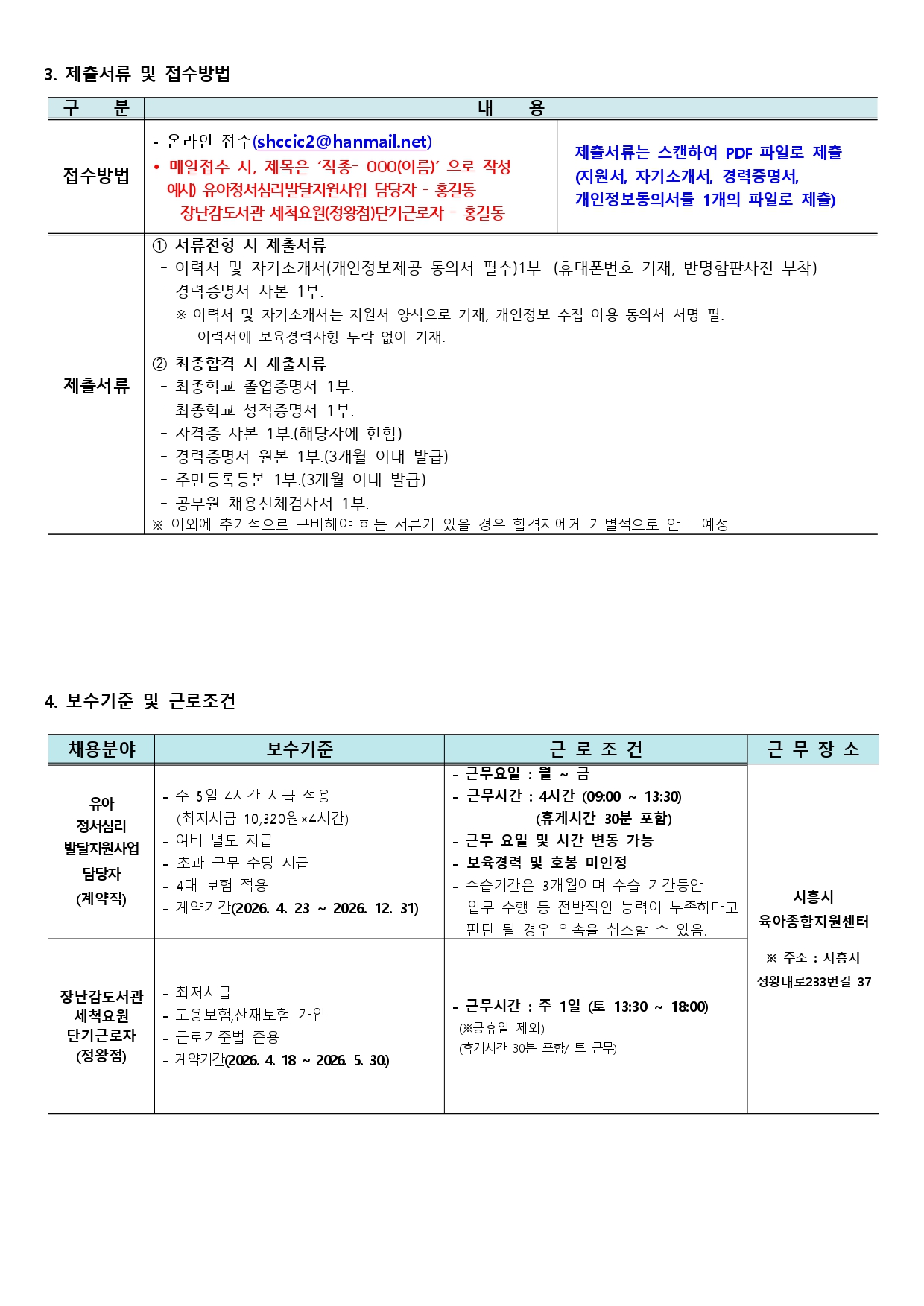 [외부] [시흥시육아종합지원센터] 직원(유아정서심리발달지원사업,장난감도서관 세척요원 단기근로자(정왕점) 채용 안내