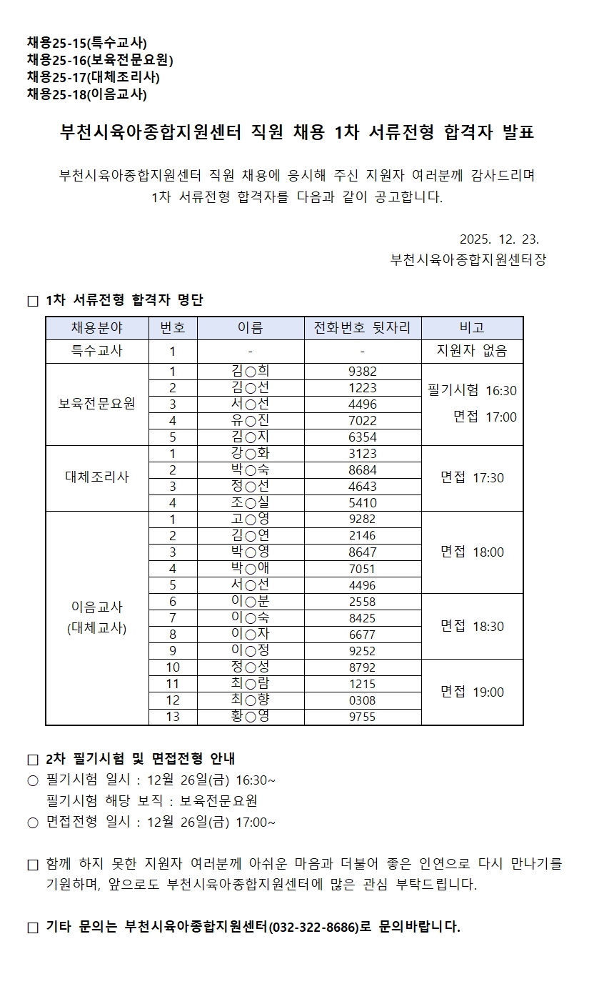 [센터] 25-15(특수교사), 16(보육전문요원), 17(대체조리사), 18(대체교사) 1차 서류전형 합격자 발표