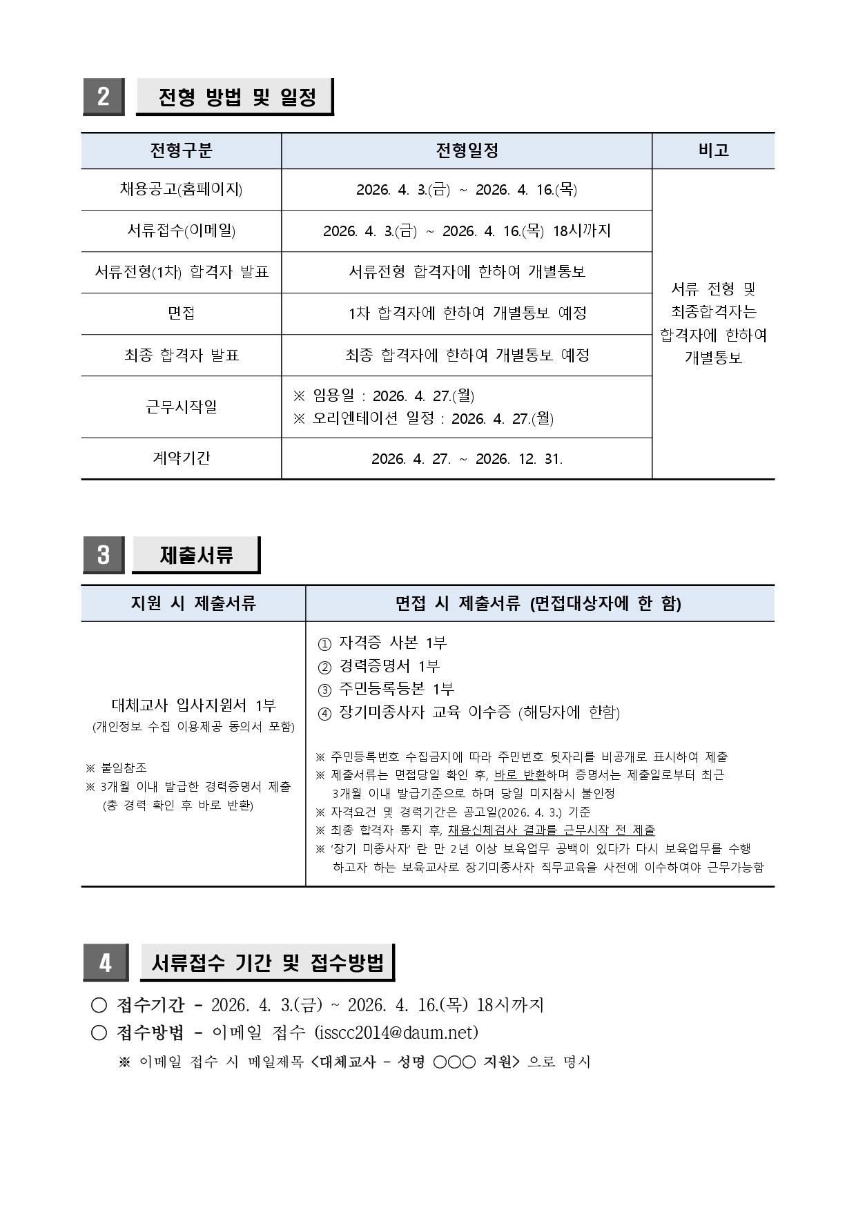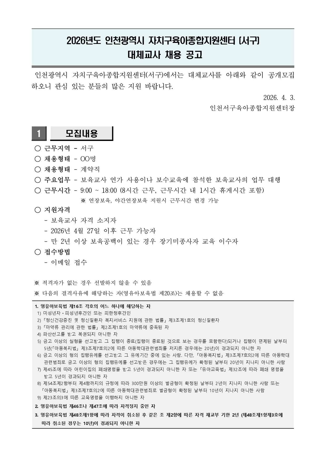 [외부] [인천서구육아종합지원센터] 대체교사 채용 안내