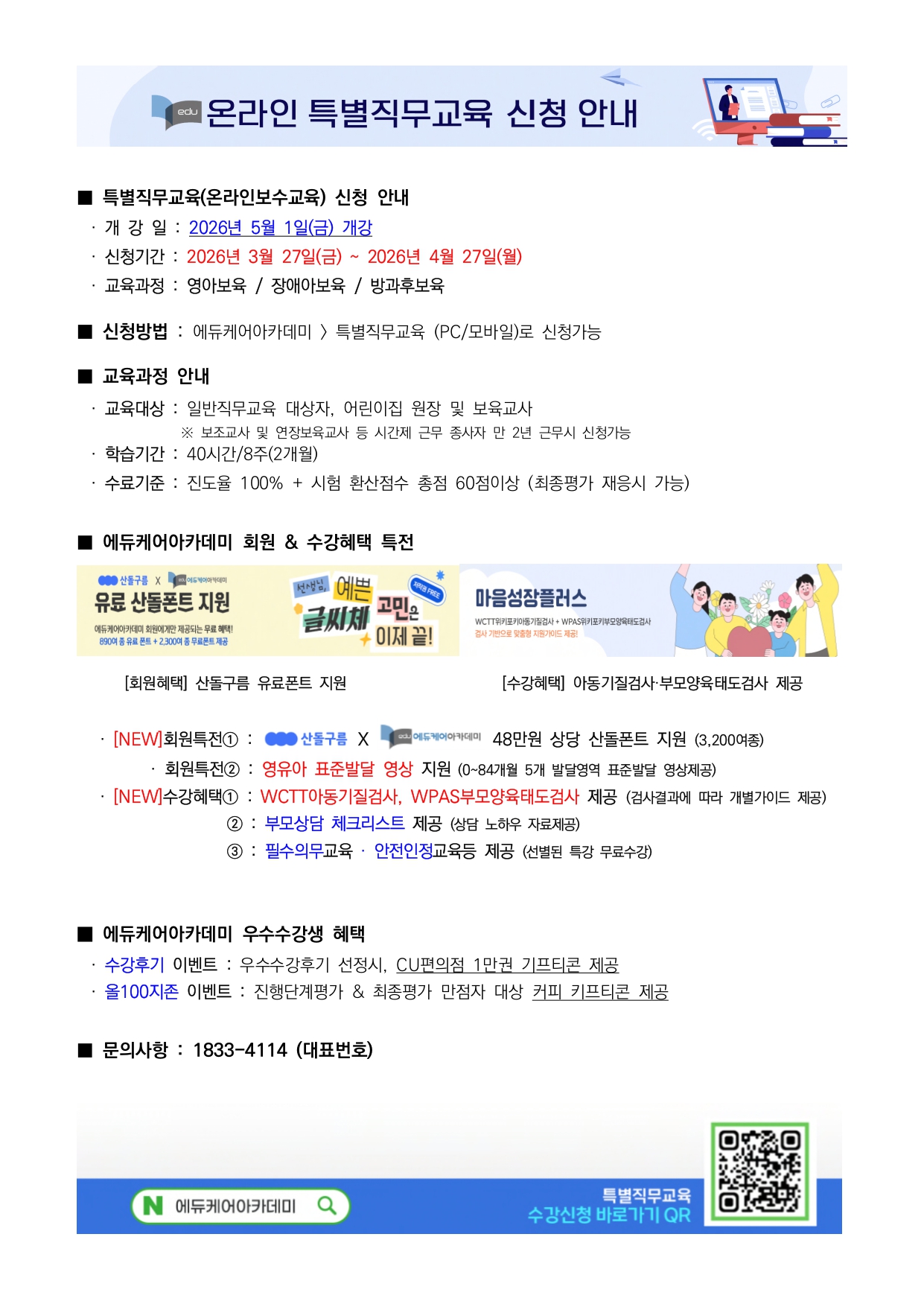 [외부] [에듀케어아카데미] 보육교직원 온라인 특별직무교육 2026년 5월 개강 교육신청안내
