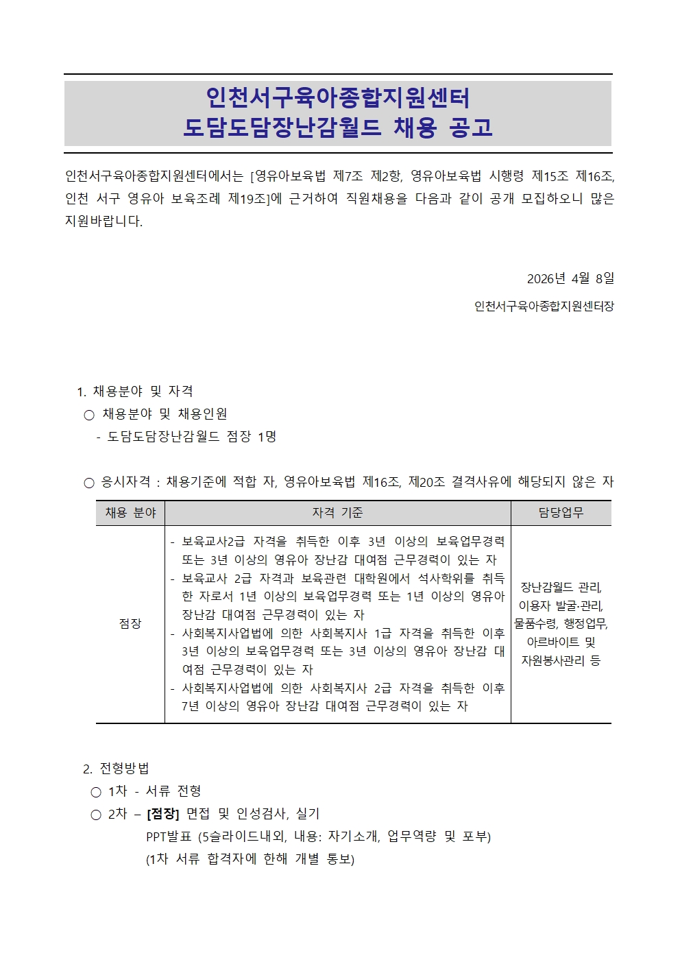[외부] [인천서구육아종합지원센터] 직원 채용 안내 (도담도담장난감월드 연희점 점장)