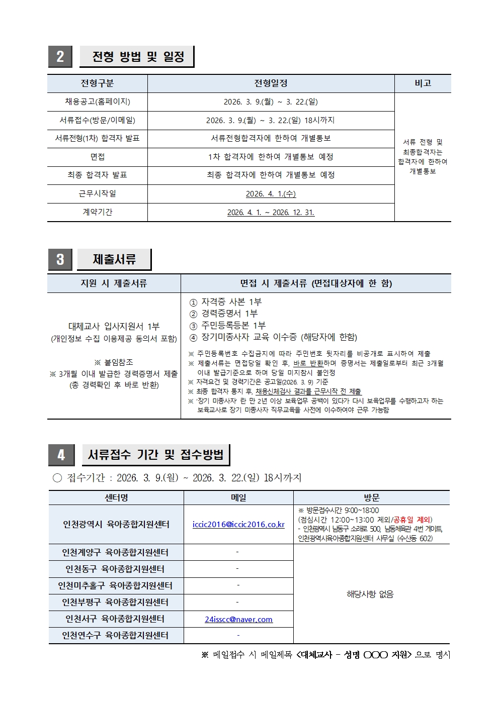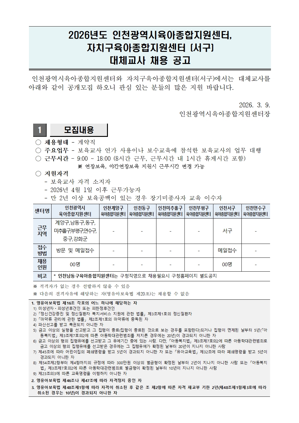 [외부] [인천광역시육아종합지원센터, 인천서구육아종합지원센터] 대체교사 채용 안내