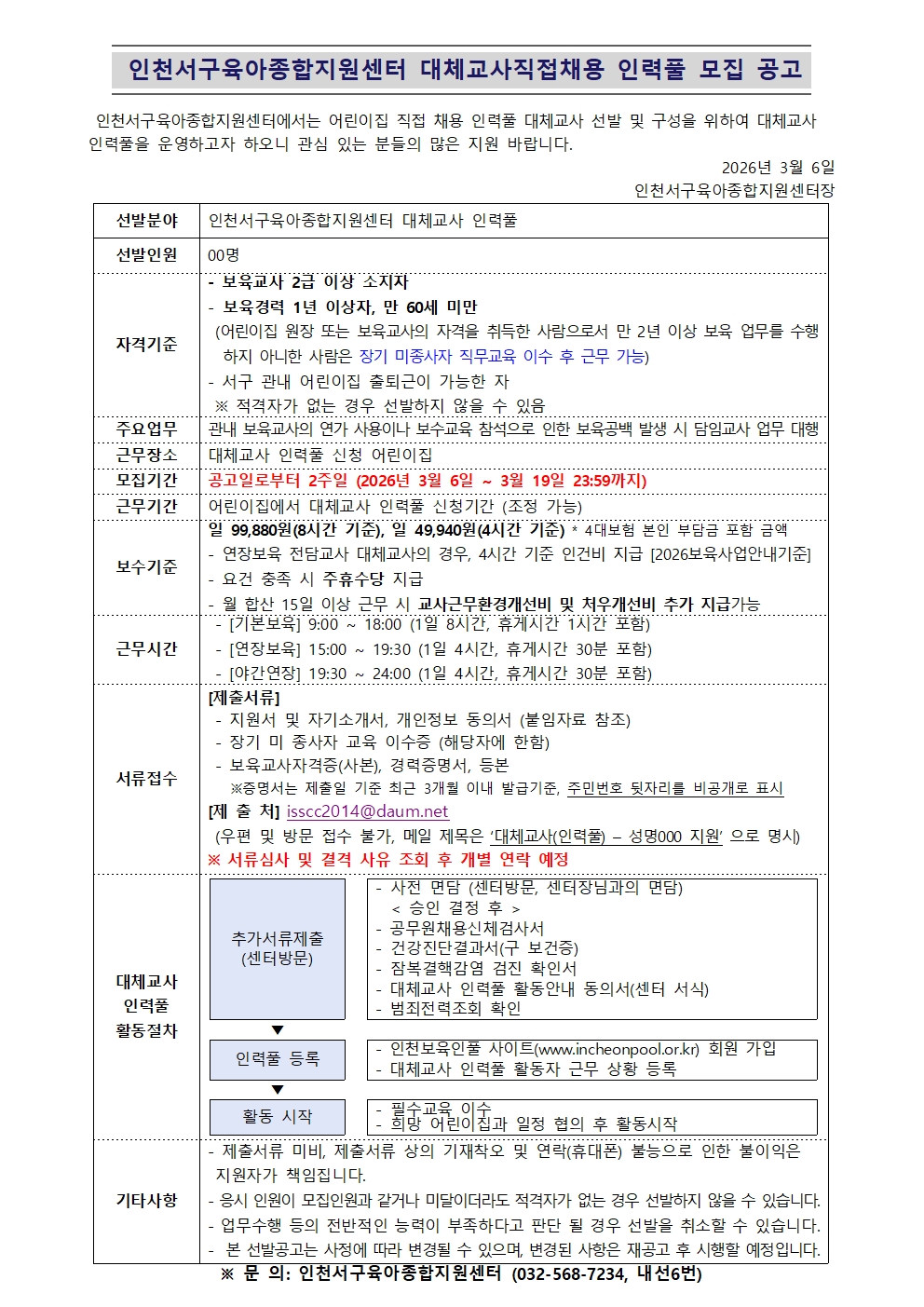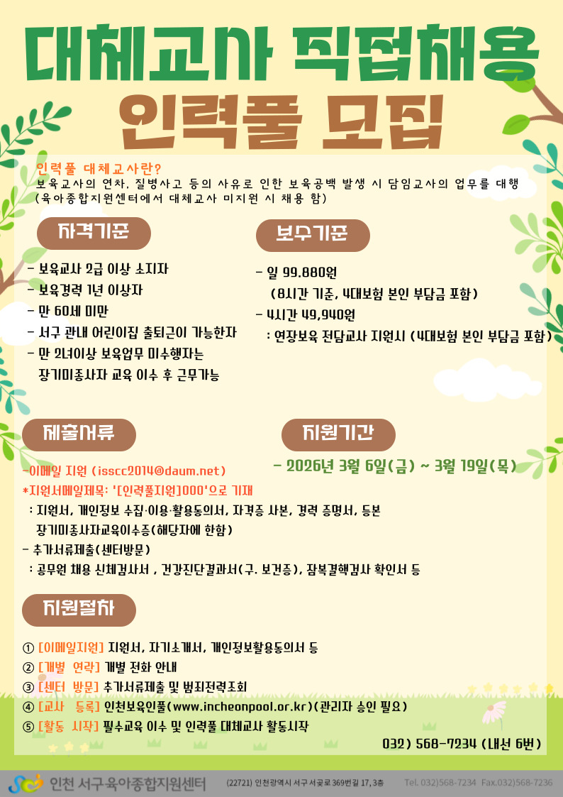 [외부] [인천서구육아종합지원센터] 「2026년 대체교사직접채용 인력풀 모집」 안내