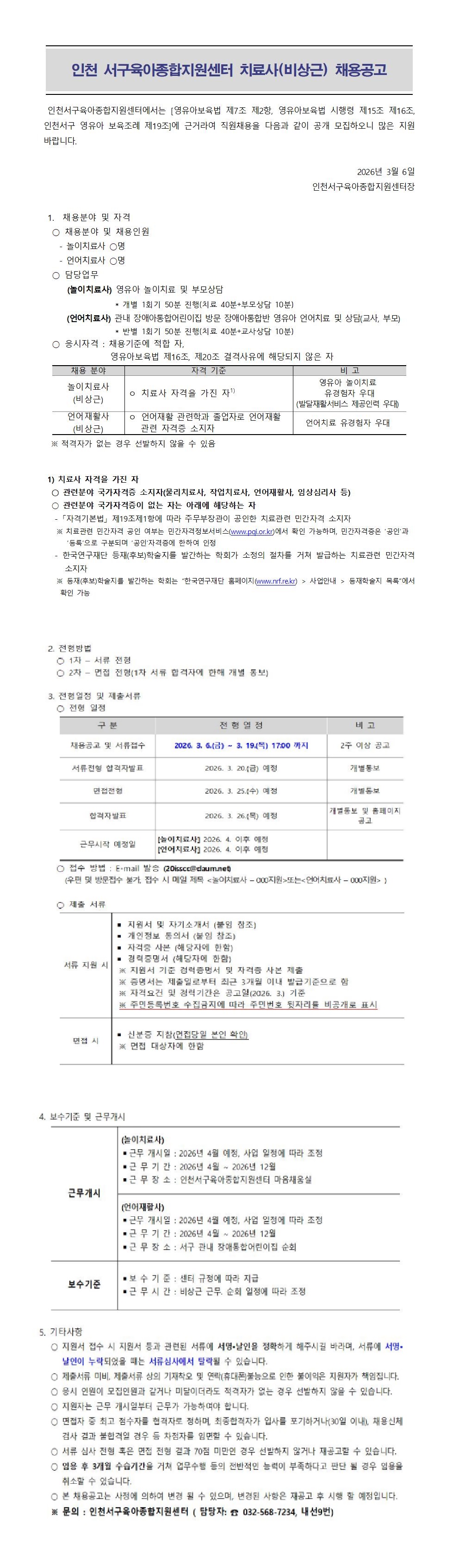 [외부] [인천서구육아종합지원센터] 치료사(언어, 놀이 / 비상근) 채용 안내