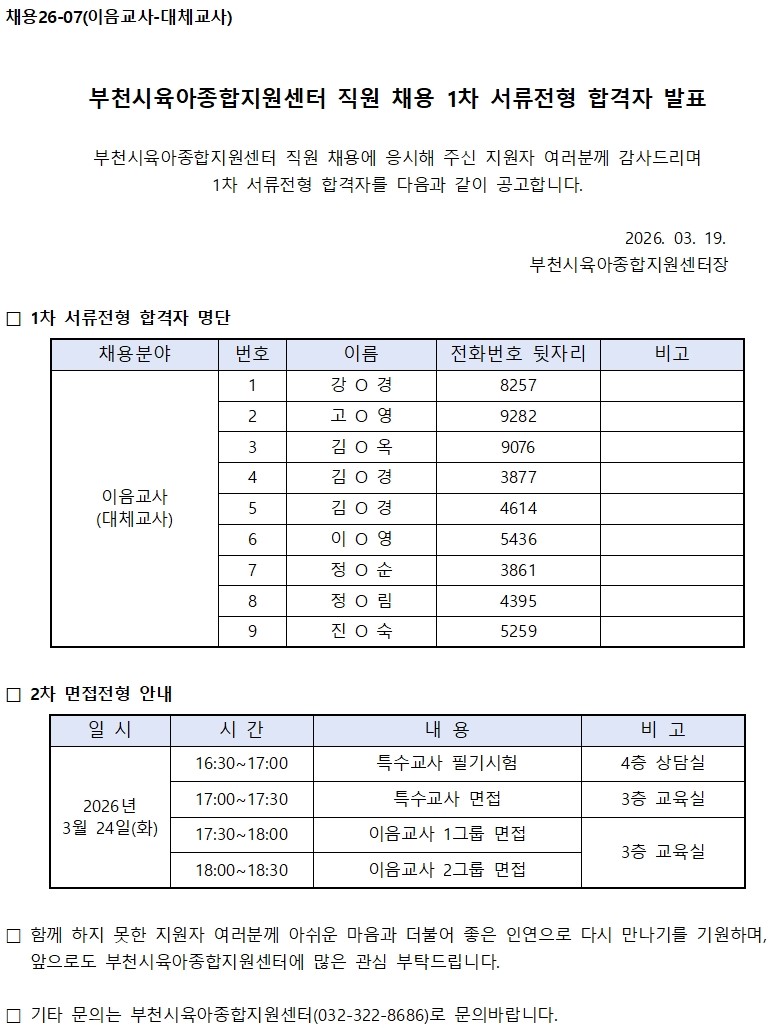 [센터] 26-07 이음교사(대체교사) 직원 채용 1차 서류전형 합격자 발표