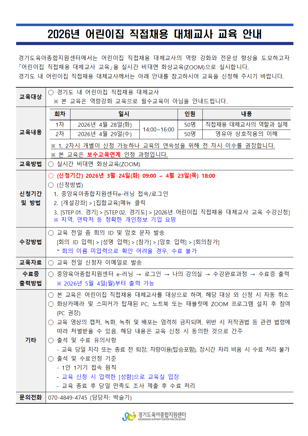 [외부] [경기도육아종합지원센터] 2026 어린이집 직접채용 대체교사 교육 안내