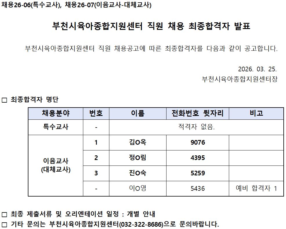 [센터] 26-06, 07 직원 채용 최종합격자 발표