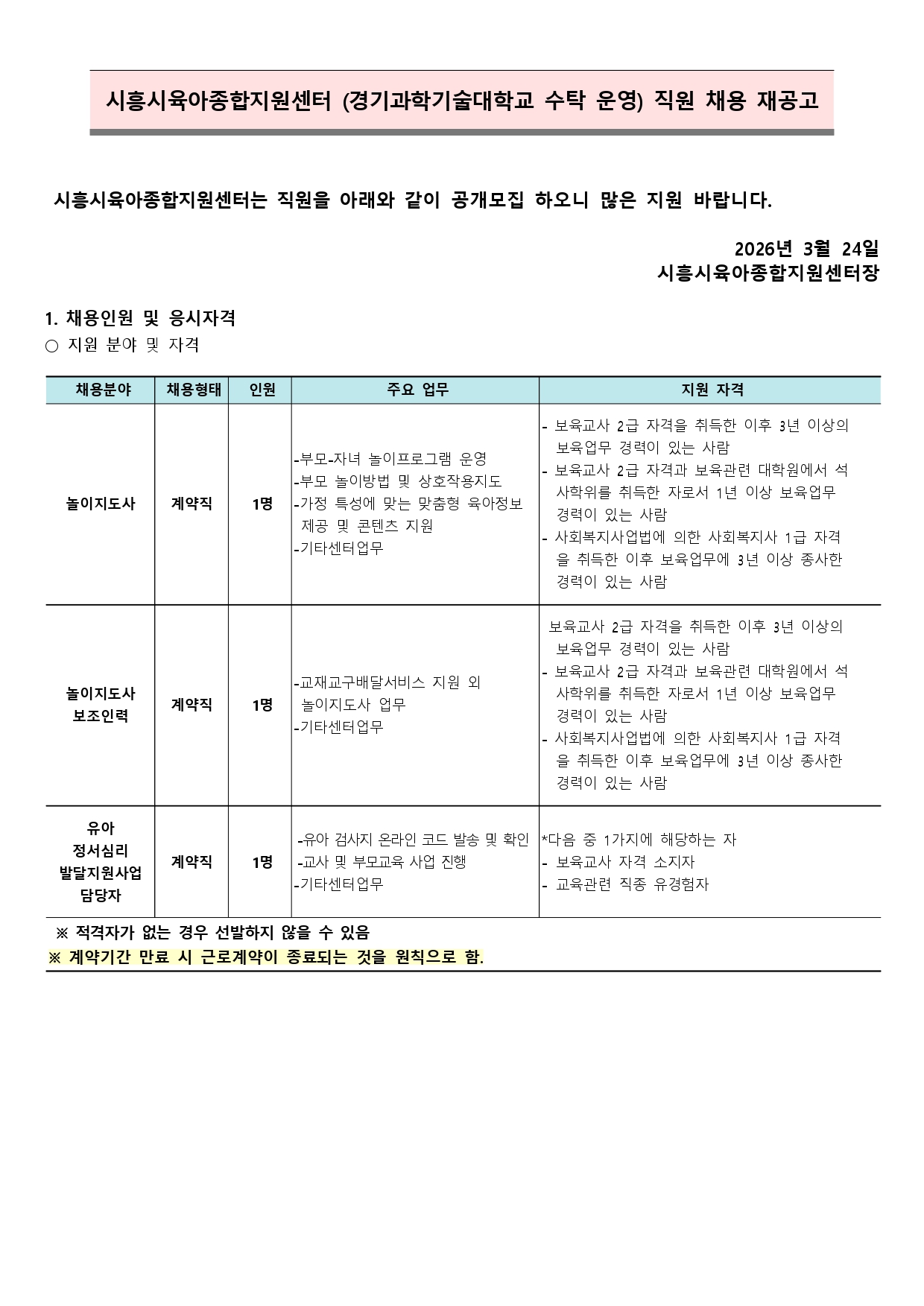 [외부] [시흥시육아종합지원센터] 직원(놀이지도사, 놀이지도사보조인력, 유아 정서심리 발달지원사업 담당자) 채용 안내