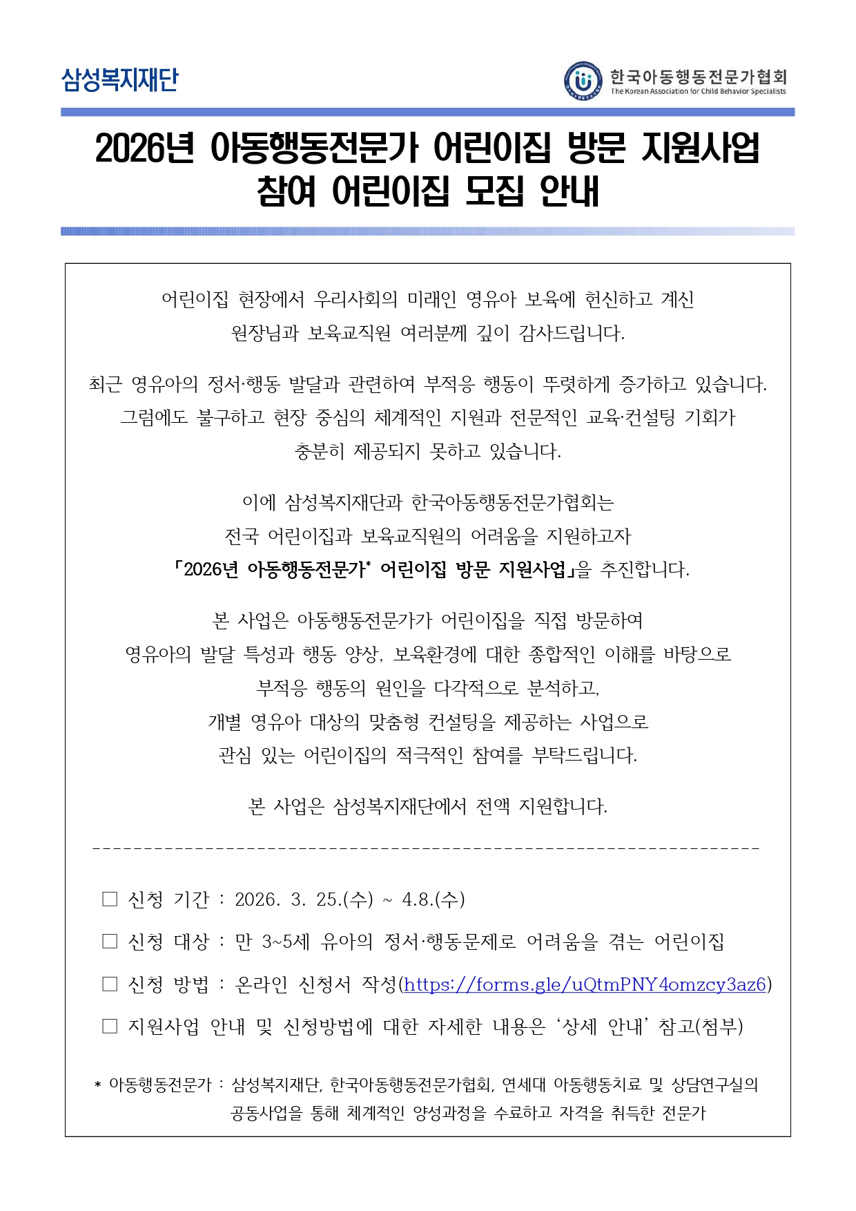 [외부] [삼성복지재단] 아동행동전문가 전국어린이집 방문지원 참여어린이집 모집 안내