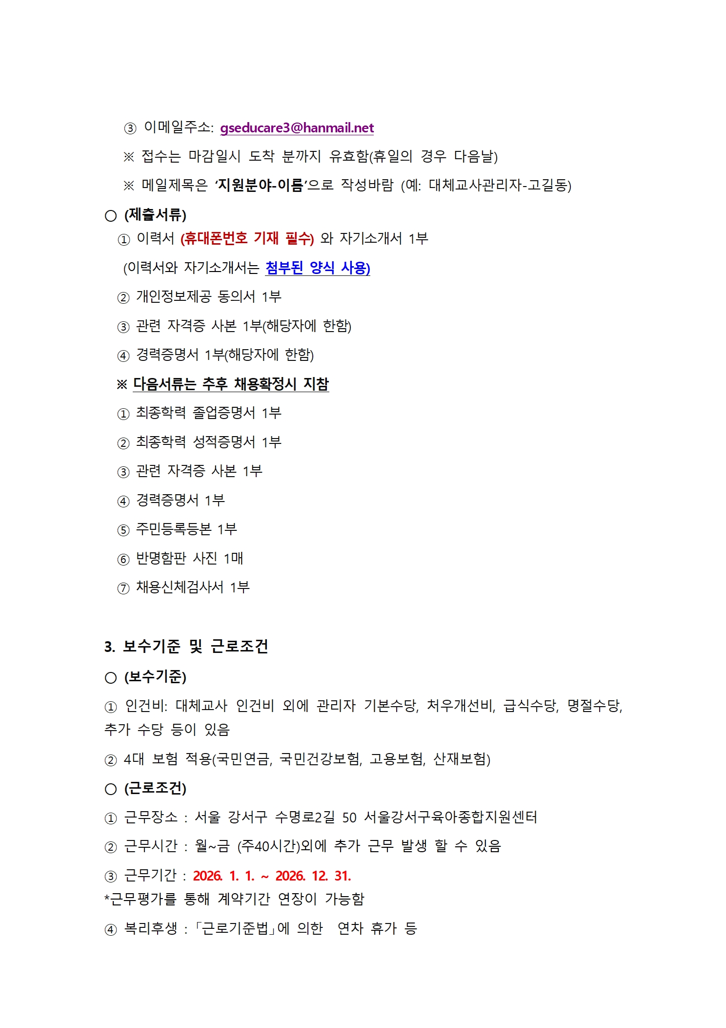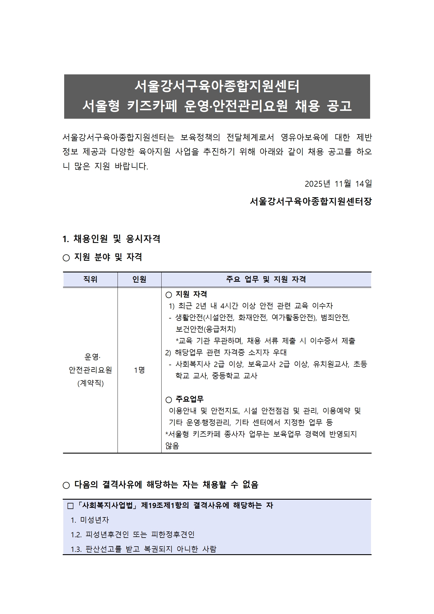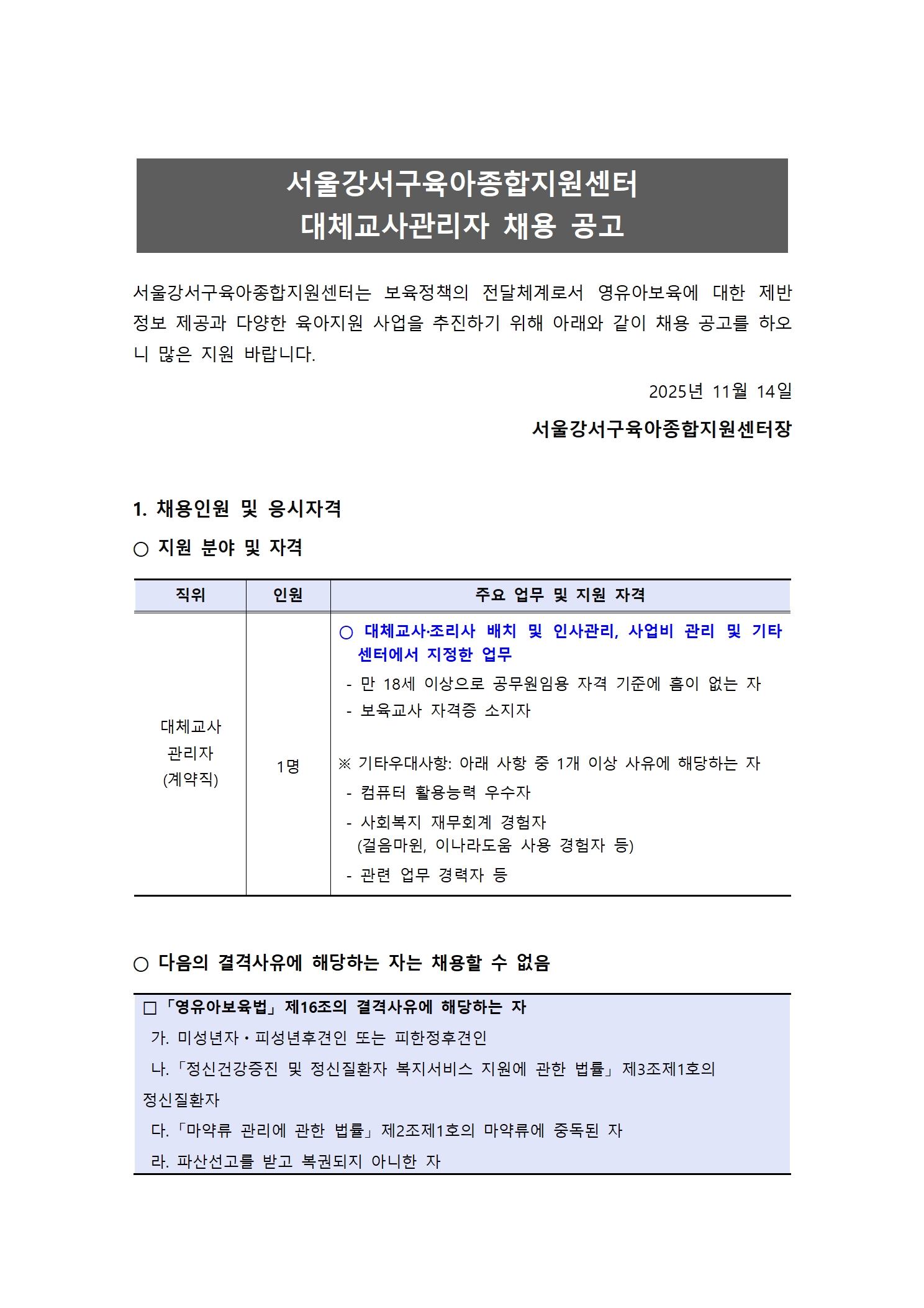 [외부] [서울강서구육아종합지원센터] 직원(대체교사관리자, 서울형 키즈카페 안전관리요원) 채용 안내