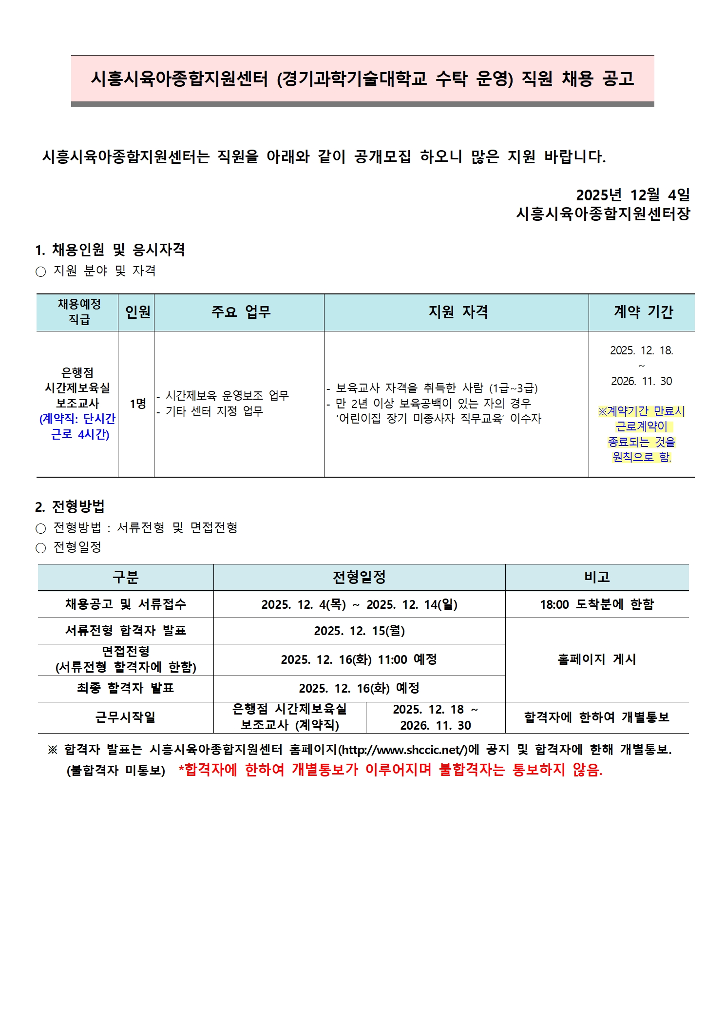 [외부] [시흥시육아종합지원센터] 직원(시간제 보조교사-은행점) 채용 안내