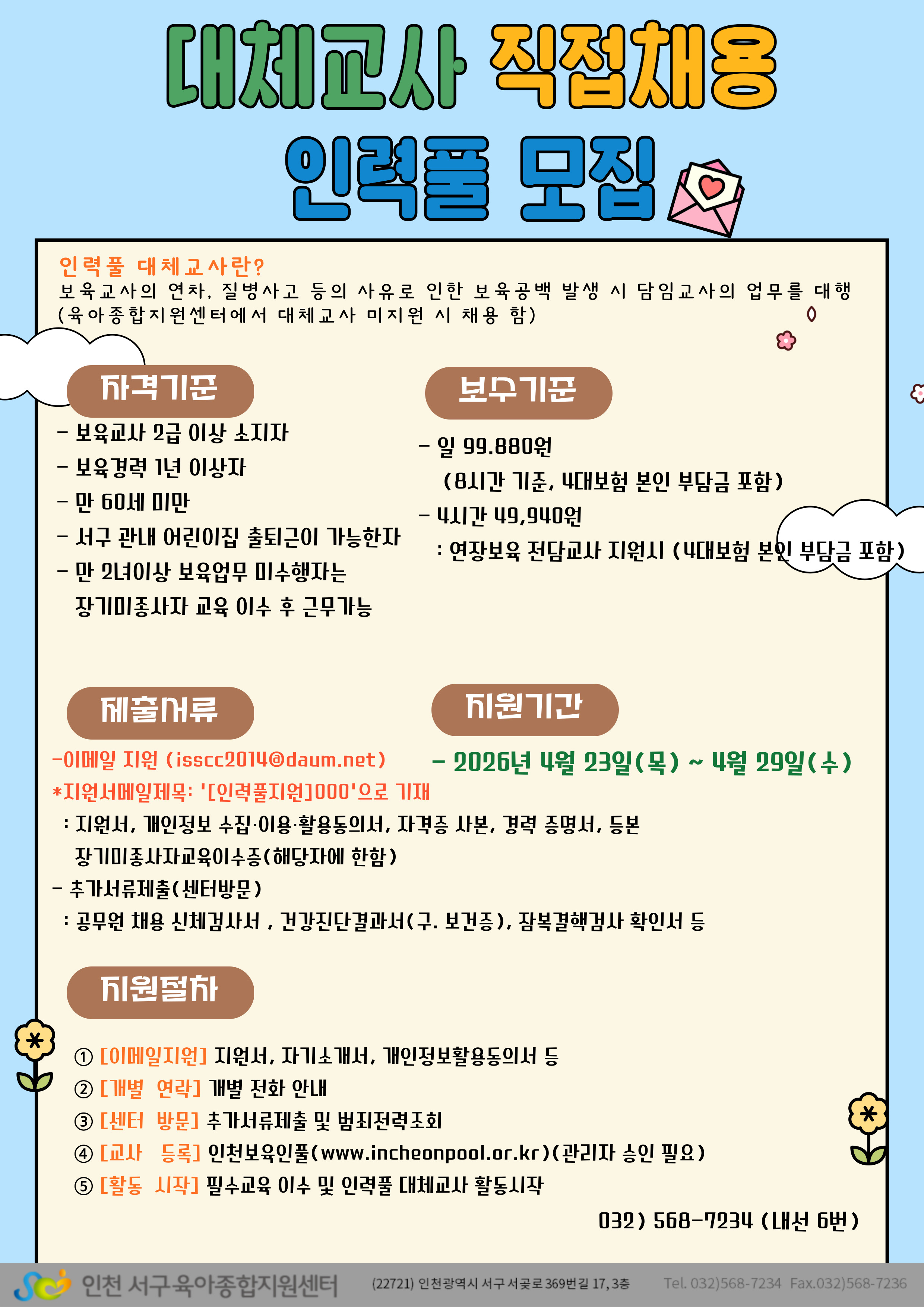 [외부] [인천서구육아종합지원센터] 대체교사(인력풀) 선발모집 안내