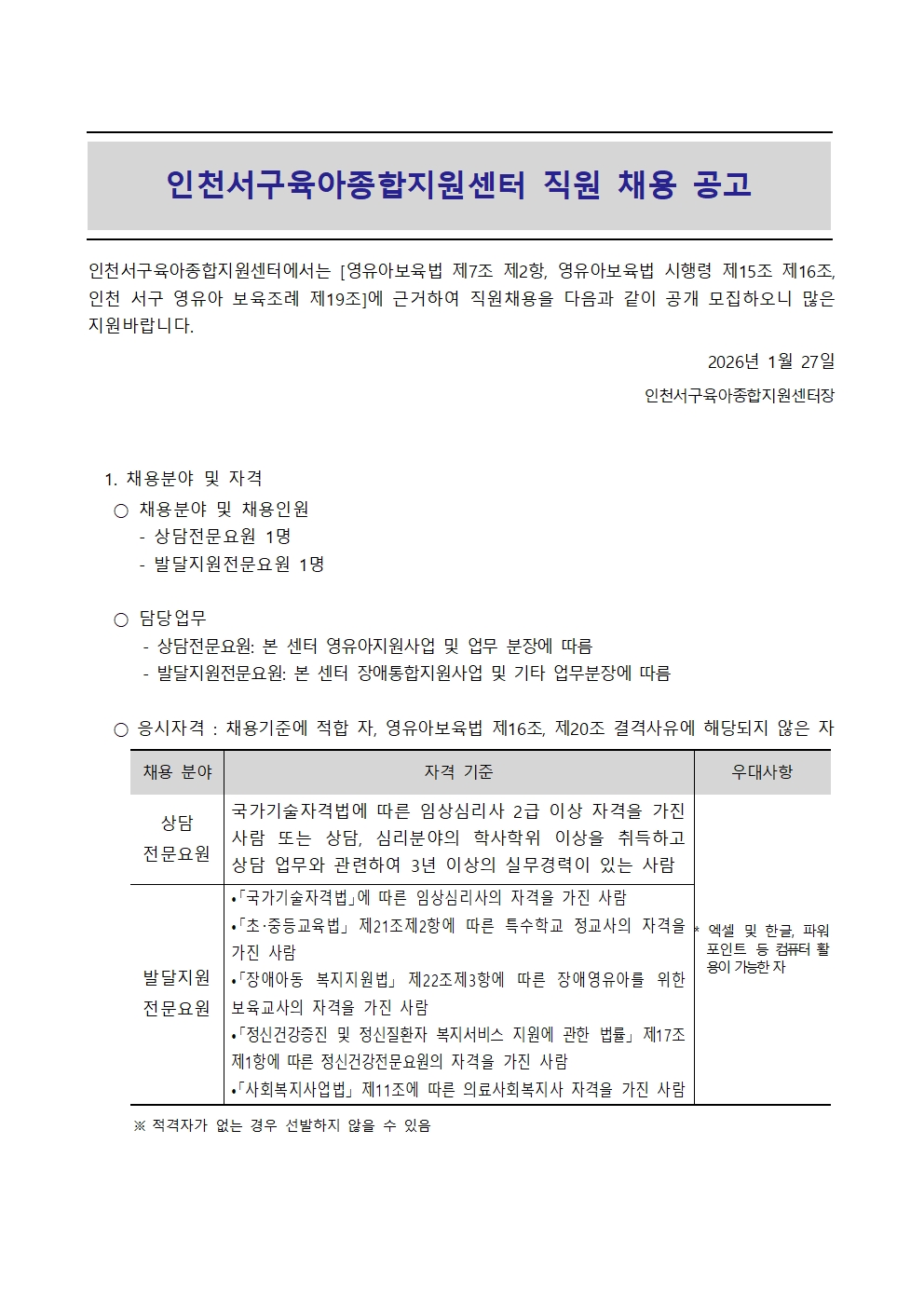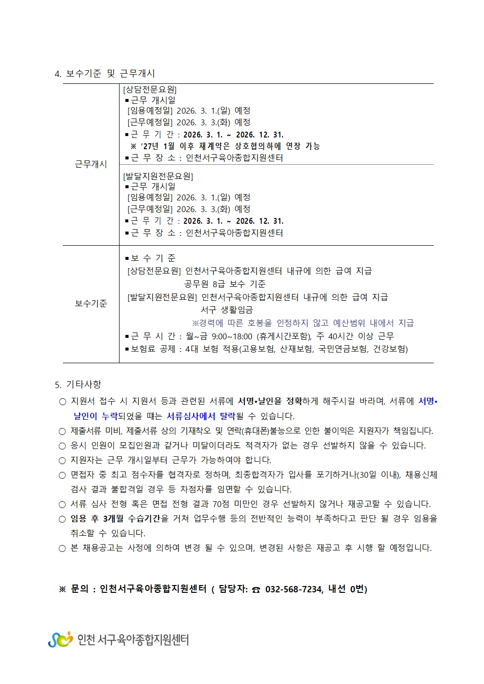 [외부] [인천서구육아종합지원센터] 직원(발달지원전문요원, 상담전문요원) 채용 안내