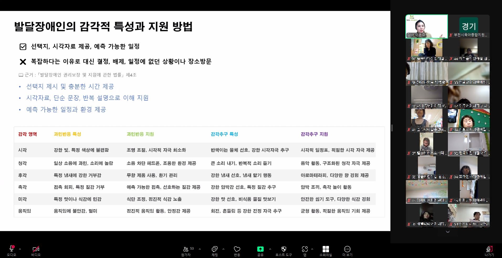 장애인식개선교육이 이윤주대표(이루다교육지원센터)의 강의로 진행되었습니다.