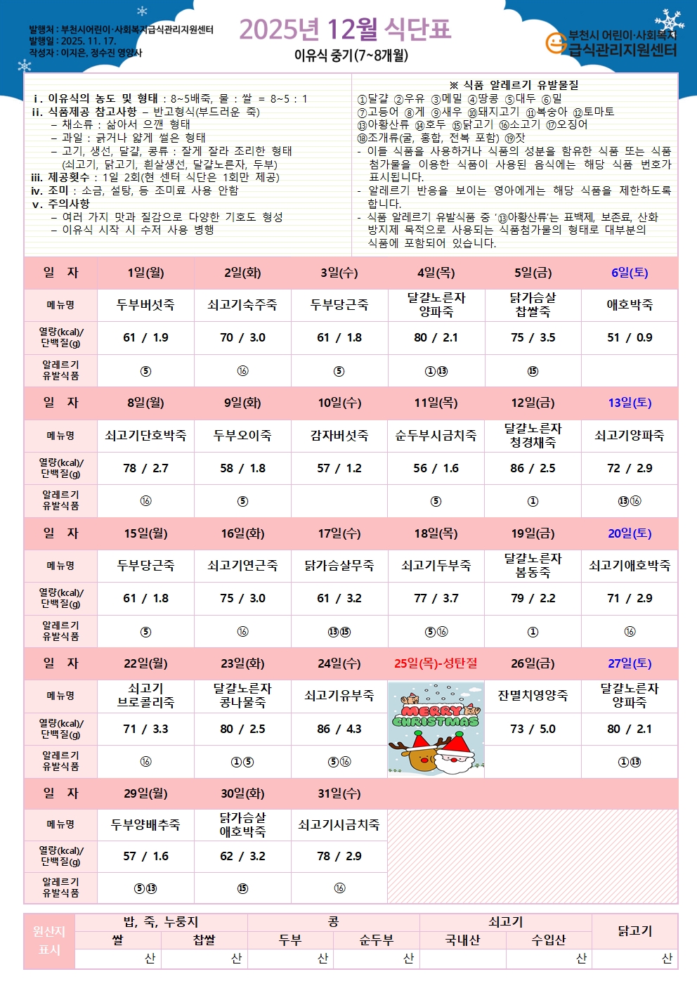 [이유식 식단] 2025년 12월 식단표 이유식 중기 식단