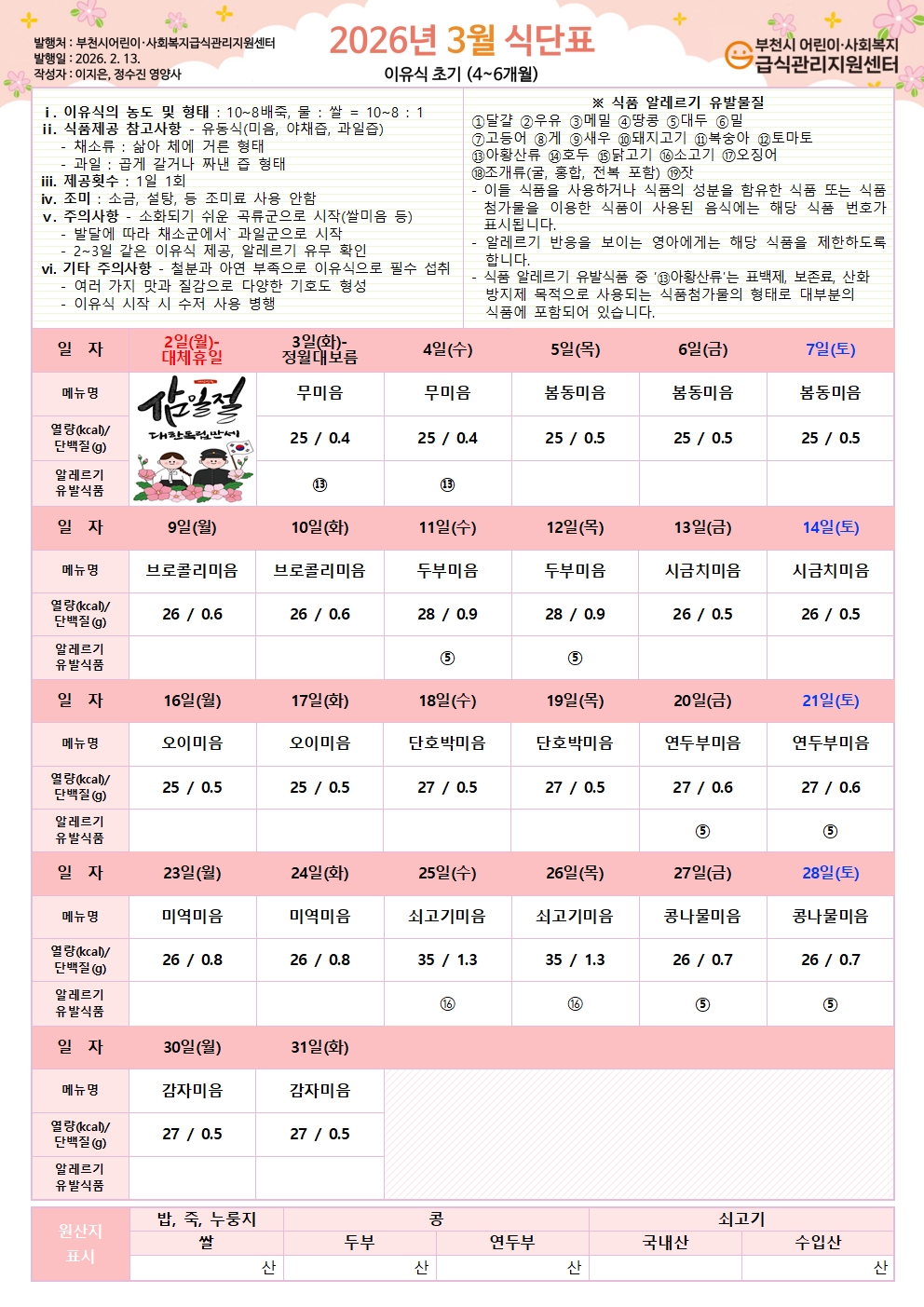 2026년 3월 식단표 이유식 중기 식단