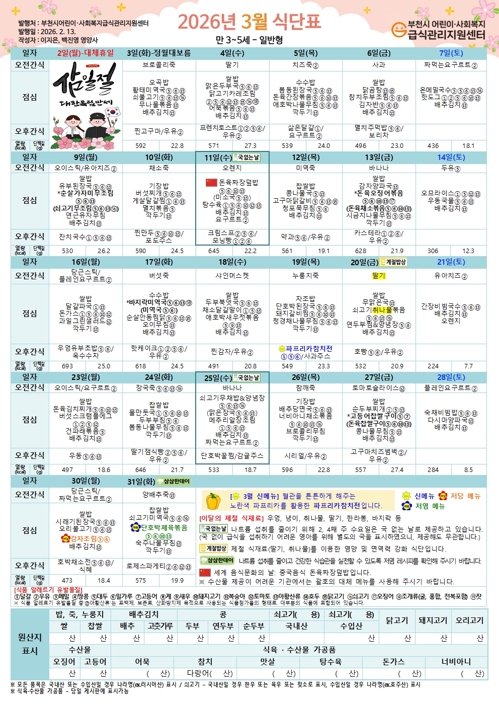 [유아식단] 2026년 3월 유아 식단