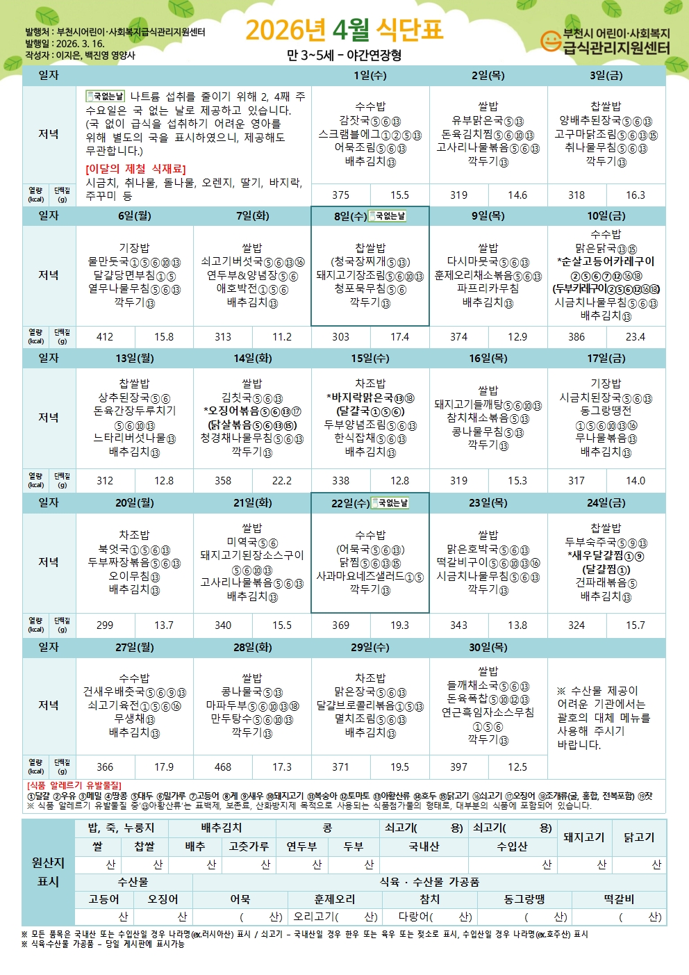 [야간연장식단] 2026년 4월 유아 야간연장 식단