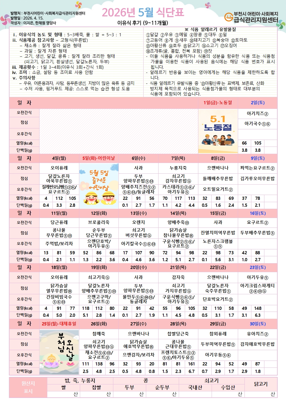 2026년 5월 식단표 이유식 중기 식단 (수정-5/1 노동절 반영)