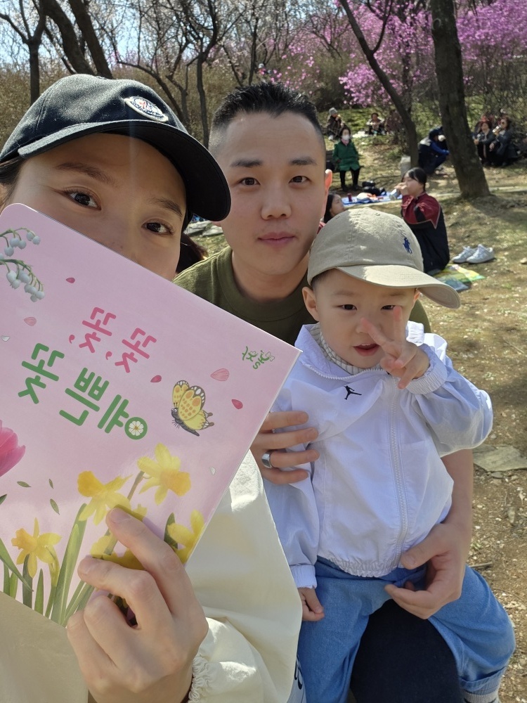 엄마, 아빠와 함께 진달래 동산에 가서 '꽃 꽃 예쁜 꽃' 그림책을 읽었어요